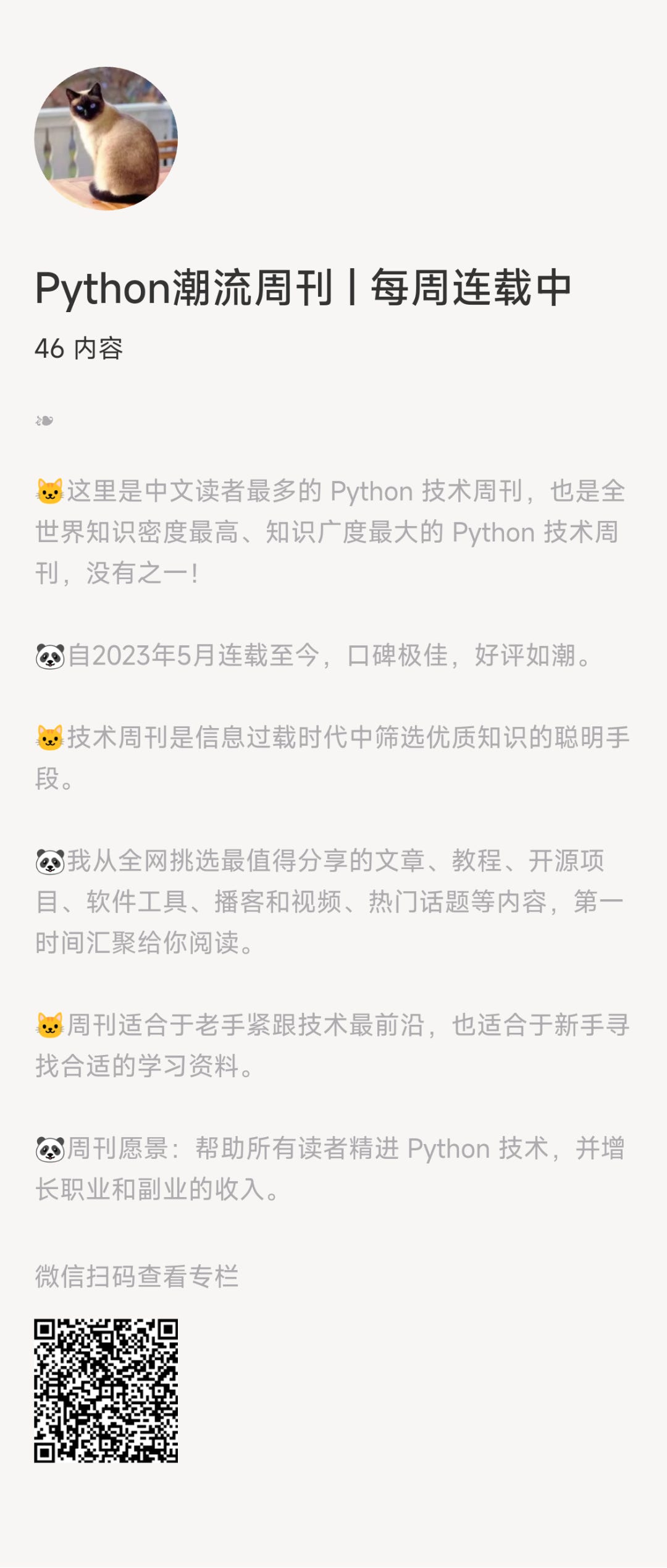 出于对 Python 的热爱以及对国外几个 Python 周刊的效仿,我从一年前开始连载《Python潮流周刊》。在这段时间里,我一直有把商业变现放在心上,只不过它的优先级并没有太靠前。