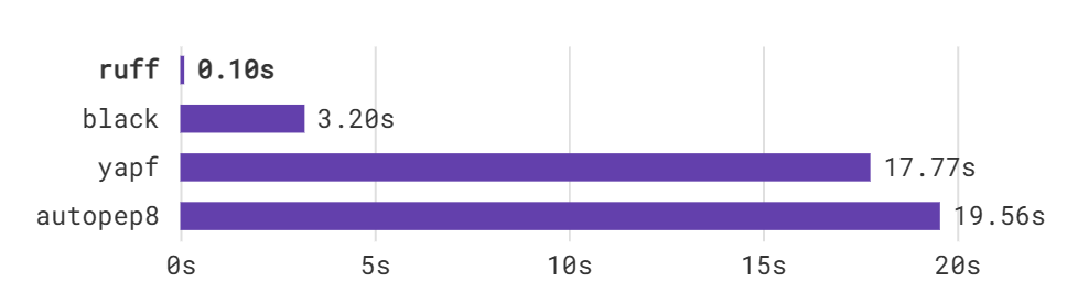 我在今年 4 月份介绍过 性能最快的代码分析工具 Ruff,当时发现它不局限于 Linter 的定位,还提供了部分 Formatter 的功能。现在,它发布了重大更新,正式成为性能最快的 Python 代码格式化工具,比 Black 快 30 倍以上,比 YAPF 快 100 倍!