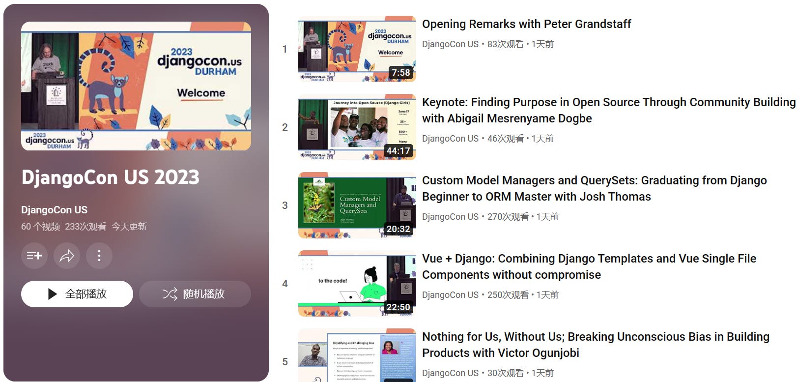 3、DjangoCon US 2023 的视频列表,60 个视频
