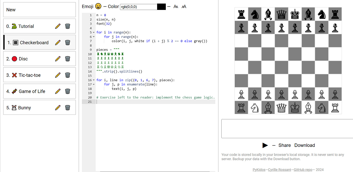 {'value': 8}An online Python programming website that makes it easy to teach kids how to code through games.